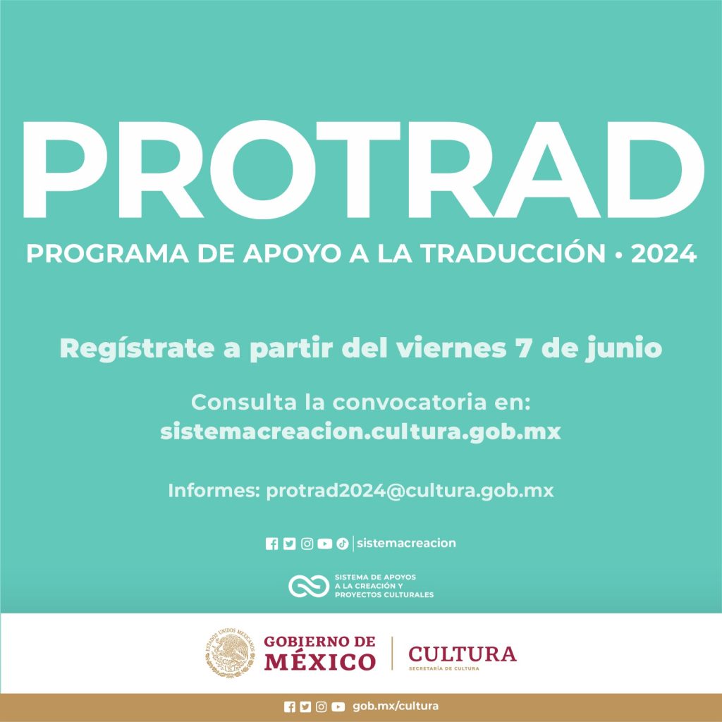 La Secretaría de Cultura del Gobierno de México, a través del Sistema Creación (antes Fonca), invita a participar en la Convocatoria 2024 del Programa de Apoyo a la Traducción (Protrad), con la postulación de proyectos literarios de personas autoras mexicanas y extranjeras, con la finalidad de traducirlos y publicarlos en formato impreso.