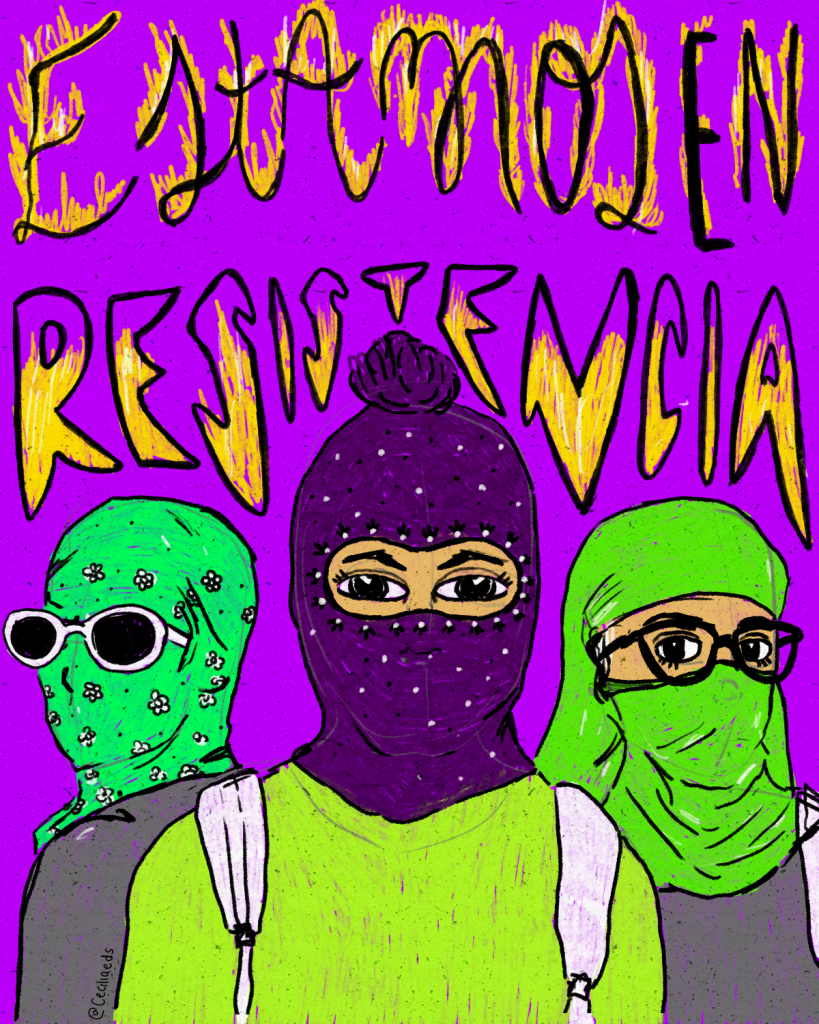 -Es interesante porque un tiempo en el que yo estuve haciendo cosas, también estuve haciendo fanzines y básicamente todo lo que estaba dibujando no era para nada político, era […] cosas que de alguna forma distrajeran a las personas y me distrajeran a mí de todo el caos del mundo, pero creo que sí llega un punto, principalmente ahorita en esta situación, en donde ya no puedo separar, lo político ya forma parte de mi día a día y entonces creo que eso también se está viendo reflejado un poco en mis dibujos.