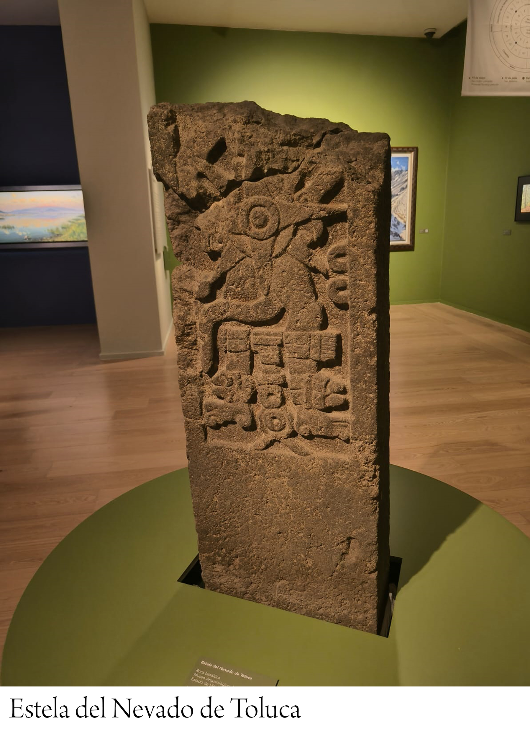 Sobresale en esta nueva muestra del artista Obregón una pieza llamada Estela del Nevado de Toluca, pieza calendaria que marcaba el lugar de observación simbólica de los amaneceres y permitía contar los días mediante la sombra del sol. Ésta actualmente pertenece al acervo del museo arqueológico Dr. Ramón Piña Chan. “Ha estado en Europa y Australia porque es una pieza extraordinaria, está fechada hacia el año 700 de nuestra era, tiene 1300 años de antigüedad. Se encontró a 4300 metros sobre el nivel del mar –alta montaña- y es un instrumento astronómico porque sirve para registrar el paso cenit del sol”, ahondo el arqueólogo astrónomo Arturo Montero García.