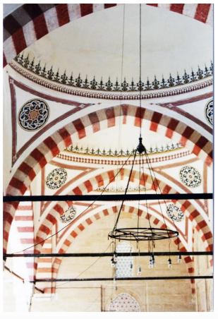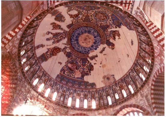 En el texto Irteş explica que el terremoto de 1752 causó grandes daños en la ciudad y también en la mezquita y que, un siglo después, durante el reinado del sultán Abdülmecid (1839-1861) se cubrieron con yeso todas las decoraciones, principalmente en las cúpulas sustituyendolas por motivos barrocos. Retomando el testimonio de Levent Albayrak, miembro del Consejo de Fundaciones, estos motivos son una mezcla de estilos barroco, rumi y de Anatolia.