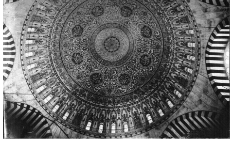 Irteş en su investigación, menciona que durante la restauración de 1983-1985 no se encontraron pinturas ni trazos originales en la cúpula principal, ya que las capas de yeso decorado del siglo XVIII y XIX los habían reemplazado. Sin embargo, sí se encontraron, aunque no menciona cómo, diseños anteriores a la intervención del siglo XIX ubicadas en las cúpulas del pórtico del patio y los techos laterales que están abiertos en las galerías.