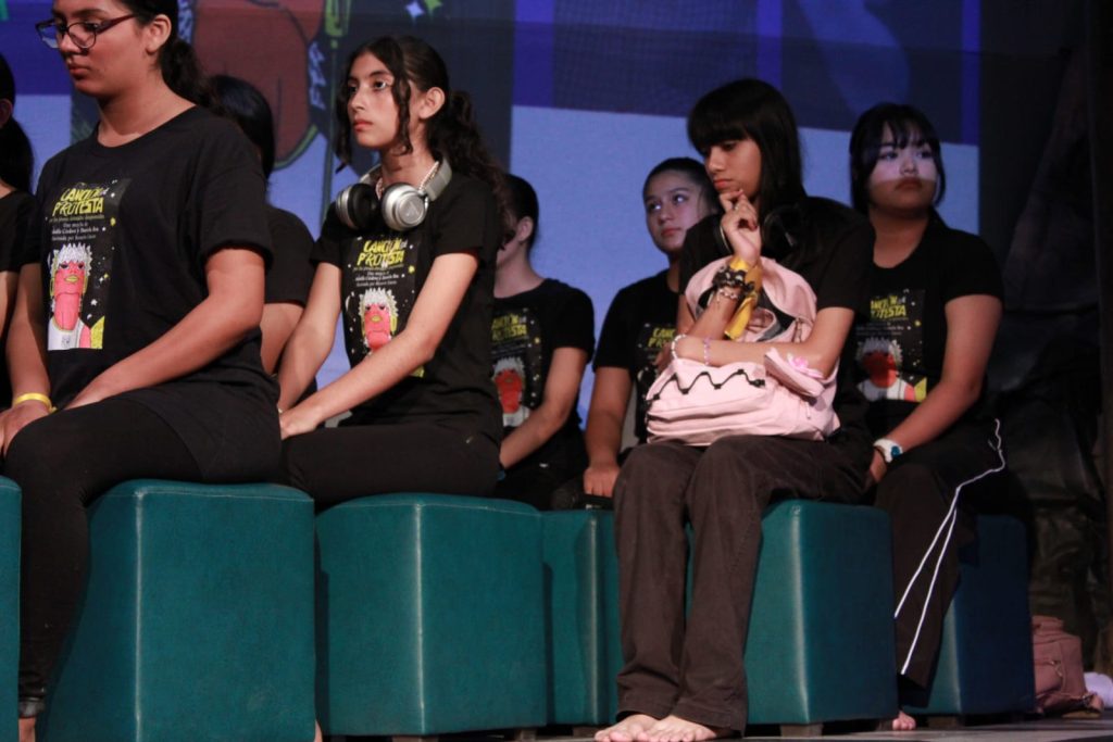 La maestra Elizabeth Azamar está en la esquina derecha del escenario. A su izquierda se encuentran sus estudiantes, sentados en los taburetes formando un semicírculo.
