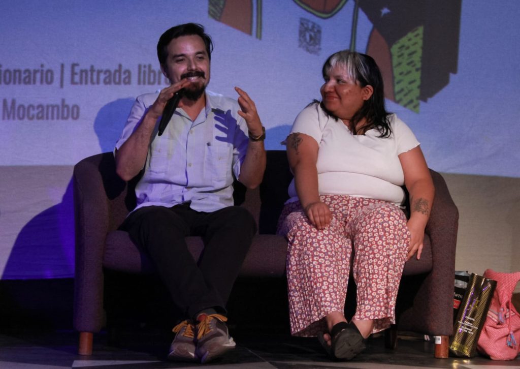 Se rompe el silencio con el grito de los nombres de cada uno de los rostros en el papel, seguido de un “ausente”, coreado por todos los jóvenes. El público tiene hecho un nudo la garganta (el público soy yo). Cuando la sala queda en silencio, tardamos un momento en aplaudir, escuchando las notas in crescendo de Hasta la raíz, de Natalia Lafourcade. Después de tomar las fotos conmemorativas, rápidamente se reacomodan los asientos para dar paso a la charla sobre el libro.